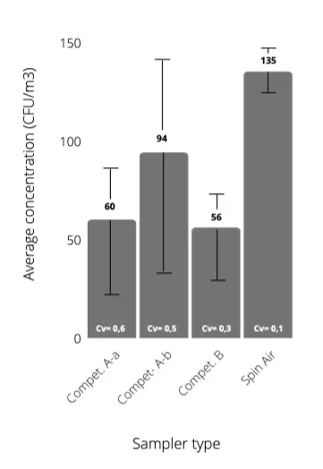 When compared against competitors’ devices, the Spin Air sampler achieves the highest number of CFU/m3. Simultaneously, the error and the coefficient of variation (cv) are the lowest recorded levels. Conversely, the other devices have a higher CV. Studies have indicated that higher CV levels can create unequal flow distribution, especially among devices designed with two sampling heads and a single aspiration pump. The Spin Air resolves this issue entirely as it features one main head as well as the option to use an attached sampler that contains its own aspiration pump.