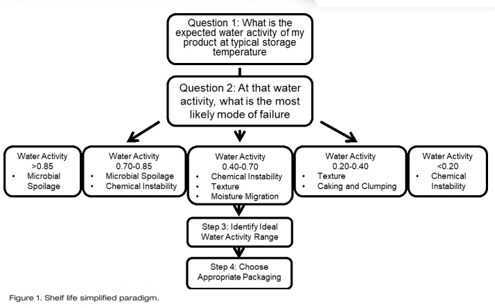 The shelf life simplified paradigm provides a step by step process for pursuing the determination of shelf life (Figure 1). Step 1 is to determine the expected water activity of the product. Step 2 is to determine at that water activity, what is the most likely mode of failure. The water activity range of your product will determine which modes of failure are the most likely to occur for your product. At water activities greater than 0.85, microbial spoilage is the biggest concern. At water activities between 0.70 and 0.85, the most likely modes of failure will be either microbial spoilage or chemical instability. Between water activities of 0.40 to 0.70, the most likely modes of failure will be chemical instability, texture changes, and moisture migration. At water activities between 0.20 in 0.40 the most likely modes of failure will be texture changes or caking and clumping. Finally, at water activities less than 0.2, the main mode of failure will be chemical instability due to an increased rate of rancidity. Once the primary modes a failure have been identified, research can be done to determine the extent of the risk and how long it will take for these modes of failure to progress enough to end the shelf life. Only the risks that are shown within the water activity range of the product need to be investigated.