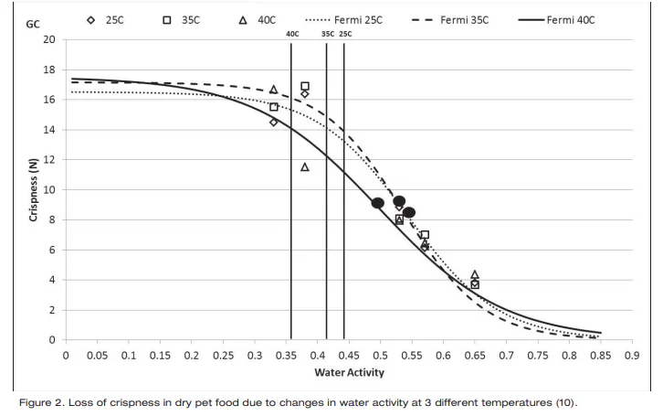 Investigations have shown documented changes in crispiness when equilibrating crisp products to various water activity values. (9, 10). Using both sensory panel data and instrumentation, the relationship between crispness, as sensed by the panel, and water activity was essentially linear, allowing identification of a water activity range where crispness changed from acceptable to unacceptable. In general, crisp products will maintain their texture until they move beyond the critical water activity where a sigmoidal loss in texture will occur (Figure 2).