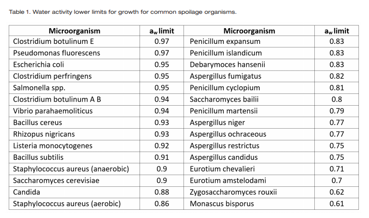 Each microorganism has an ideal internal water activity and their ability to reproduce and grow depends on maintaining that water activity. When a microorganism encounters an environment where the water activity is lower than their internal water activity, they experience osmotic stress and begin to lose water to the environment, since water moves from high water activity (energy) to low water activity (1). This loss of water reduces turgor pressure and retards normal metabolic activity. To continue reproducing, the organism must lower its internal water activity below that of the environment. It tries to achieve this by concentrating solutes internally. The ability to reduce its internal water activity using these strategies is unique to each organism. Consequently, each microorganism has a unique limiting water activity below which they cannot grow (2, 3). Notice that an organism’s ability to reproduce and grow does not depend on how much water is in its environment (moisture content or free water), only on the energy of the water (water activity) and whether it can access that water for growth.
