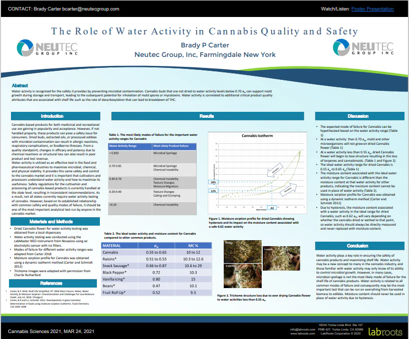 Cannabis-based products for both medicinal and recreational use are gaining in popularity and acceptance. However, if not handled properly, these products can pose a safety issue for consumers. Dried buds, extracted oils, or processed edibles with microbial contamination can result in allergic reactions, respiratory complications, or foodborne illnesses. From a quality standpoint, changes in efficacy and potency due to chemical reactions or structural loss can also result in poor product and lost revenue. Water activity is utilized as an effective tool in the food and pharmaceutical industries to maximize microbial, chemical, and physical stability. It provides this same safety and control to the cannabis market and it is important that cultivators and processors understand water activity and how to maximize its usefulness. Safety regulations for the cultivation and processing of cannabis-based products is currently handled at the state level, resulting in inconsistent recommendations. As a result, not all states currently require water activity testing of cannabis. However, based on its established relationship with common safety and quality modes of failure, it should be one of the most important analytical test run by anyone in the cannabis market.