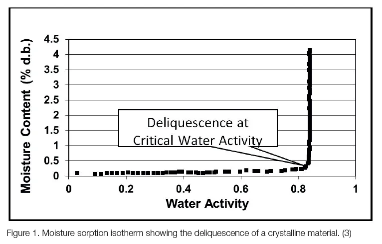 The moisture sorption isotherm, which describes the relationship of moisture content to water activity, will clearly show the deliquescence of the crystalline material by a sharp 90 degree turn in the isotherm (Figure 1) (2). The water activity where these changes occur is called “critical water activity.” The key to avoiding problems with a crystalline excipient is to specify that the water activity be in a safe range based on the critical water activities identified through the moisture sorption isotherm. Any incoming excipient supplies should then be monitored for water activity to ensure that this specification is being met.
