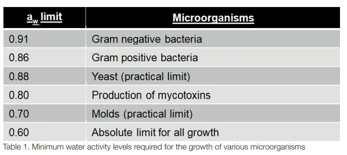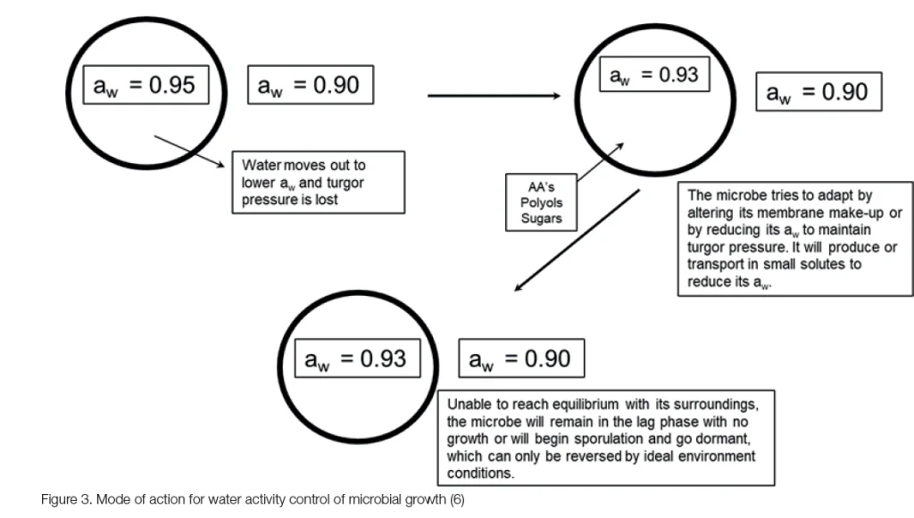 In response, the organism will try to control its internal water activity through the concentration of solutes. This ability to lower the internal water activity is unique to each organism, which is why different microorganisms have different water activity minimum growth limits (Table 1)(7).