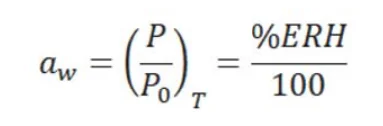 Water activity is defined as the energy status of water in a system and is rooted in the fundamental laws of thermodynamics through the Gibbs free energy equation. It represents the relative chemical potential energy of water as dictated by the surface, colligative, and capillary interactions in a matrix. Practically, it is measured as the partial vapor pressure of water (P) in a headspace that is at equilibrium with the sample, divided by the saturated vapor pressure (P0) of water at the same temperature (T). Water activity is equal to the Equilibrium Relative Humidity (ERH) divided by 100: