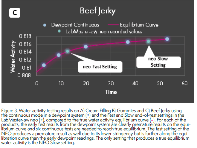 To illustrate the potential problems introduced by prematurely ending water activity tests before vapor equilibrium has been achieved, water activity tests were run on samples of cream filling, gummies, and beef jerky.