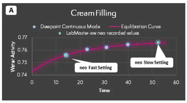 In the dewpoint instrument, the water activity of each completed test in continuous mode was collected until a result differed from the previous test by less than 0.002 aw.