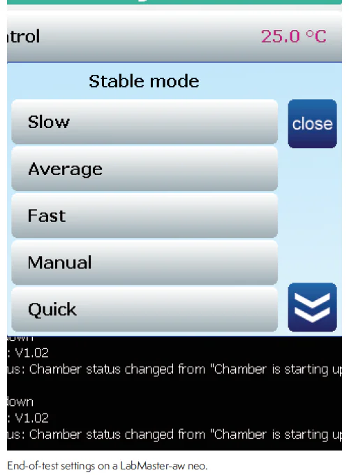 Conversely to defaulting to a low stringency end-of-test setting, Novasina allows the user to set the conditions for ending the test to either more or less stringent. For example, the Slow setting in the Novasina instrument requires no change in water activity greater than 0.001 for 6 minutes and repeated measurements using this setting will not show the drift seen with the other sensors because the setting is stringent enough to ensure true vapor equilibrium. The more stringent settings of the Novasina instrument can result in longer test times, but they also provide a true water activity measurement. The various end-of-test setting from Novasina instruments include: