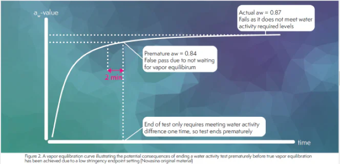 The vapor equilibrium process is not determined by the instrument or the end-of-test settings, but by the thermal dynamically controlled movement of water from the sample to the headspace. The ambiguity in the end-of-test settings and their potential impact on testing results even lead ISO to define the end-of-test requirements in their recently revised water activity method ISO18787 (2). Dewpoint systems using this ISO18787 setting will not give results as fast as with the default end-of-test settings due to its higher stringency.